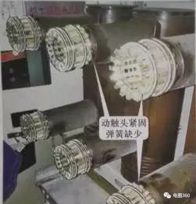 經專業人員檢查,確定母線室和后下柜無發熱開關柜,手車甲、乙相母線側動、靜觸頭和甲相下動、靜觸頭的觸頭部分發熱。開關柜電源故障檢查:將手車拉出機柜。發現一個壓縮彈簧在手車的a相母線側(上部)上的移動觸點的端部缺失,并且一個壓縮彈簧在手車的a相母線側上的下移動觸點的導電桿和b相母線側上的移動觸點的絕緣外殼側缺失(見圖17)。當檢查手車的靜態接觸情況時,發現相應的靜態接觸箱中有一個松動的壓縮彈簧(見圖18)。