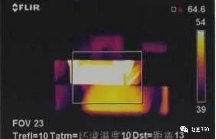 3天后,檢查10KV號主進線柜是否停電。將手車拉出機柜,并立即對手車進行紅外測溫(剩余溫度)。手車b相動觸點的總溫度為42°。7℃(剩余溫度)(見圖12),b相動觸頭前端溫度為46℃(剩余溫度)(見圖13),手車母線側靜觸頭溫度為48。5℃(剩余溫度)(見圖14),0+后穿板套管溫度為39.2℃(剩余溫度)(見圖15),0+前后手車母線側靜觸頭盒附近母線排溫度為64.6℃(剩余溫度)(見圖16)。這證明手車的手動觸點和靜態觸點的接觸部分不是熱點,開關柜后面的穿板套管也不是熱點。1號主進線柜手車母線側靜觸頭座與母線排的接觸部位是熱點。