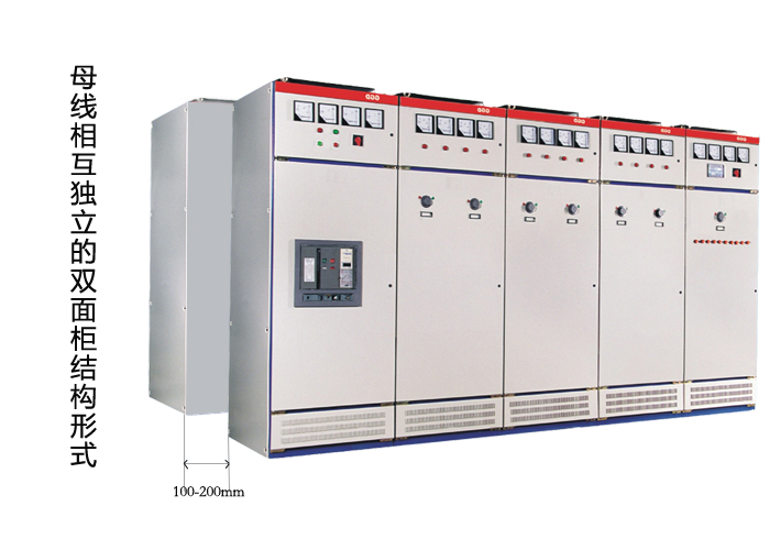 獨立總線的雙面機柜結構實質上是將兩組背靠背機柜安裝在一起,兩組開關柜的后部一般相隔100-200毫米,作為總線系統的散熱通道。
