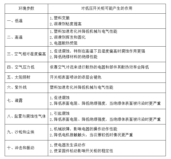 低壓開關柜在其15-20年的工作壽命期間,環境對生活的影響不可低估。環境對低壓開關柜的可能影響如表1所示。