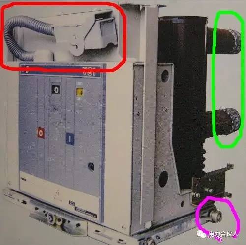 2示出了VS1斷路器手車,它像抽屜一樣放置在開關(guān)柜中,軌道上的滑輪在紫色的盒子中,二次連接插頭(處于拔出狀態(tài))在紅色的盒子中,斷路器的動(dòng)觸頭在綠色的盒子中。圖8