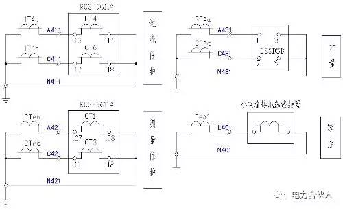 2是電流回路,包括:保護(hù)、測(cè)量、計(jì)量和小電流接地線選擇。保護(hù)裝置和電能表安裝在開關(guān)柜上,所有接線均由開關(guān)廠連接。小電流接地選線裝置安裝在主控室,零序電流L401和N400需要通過控制電纜連接到該裝置。